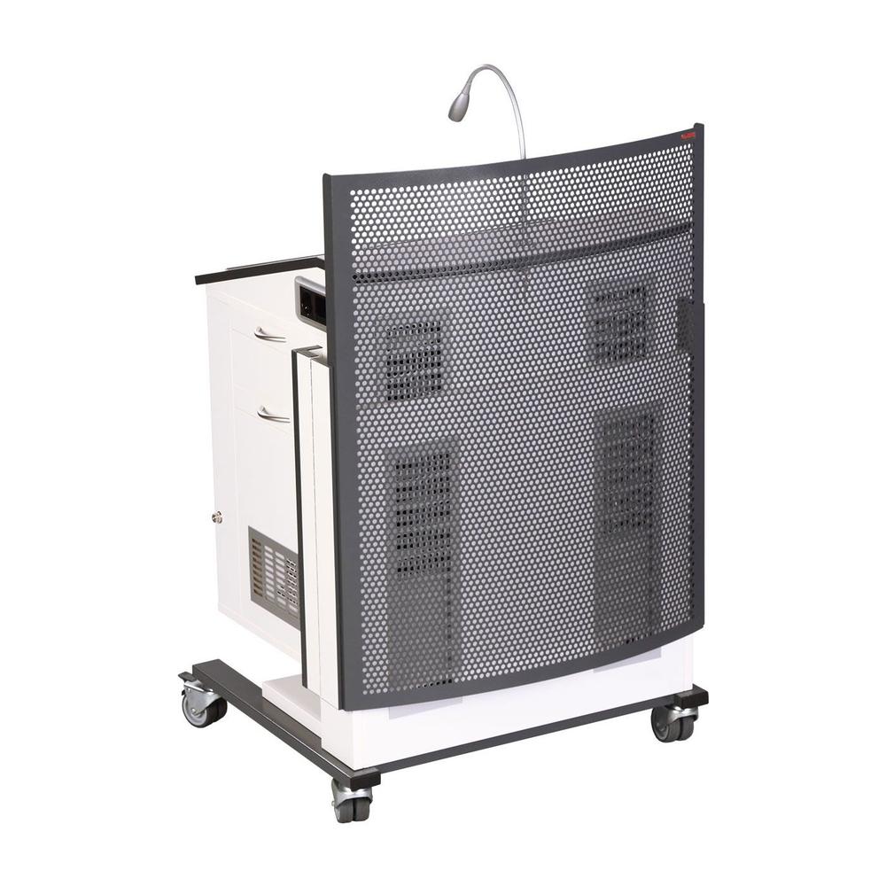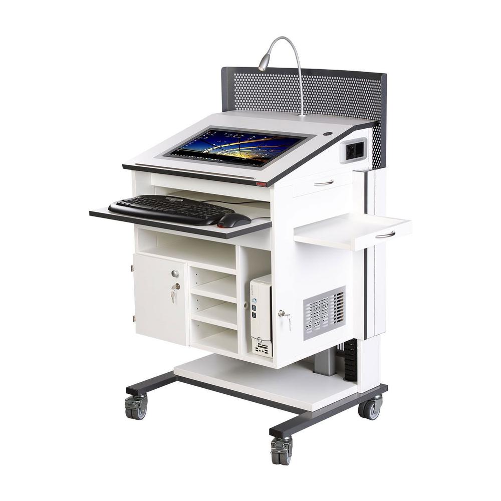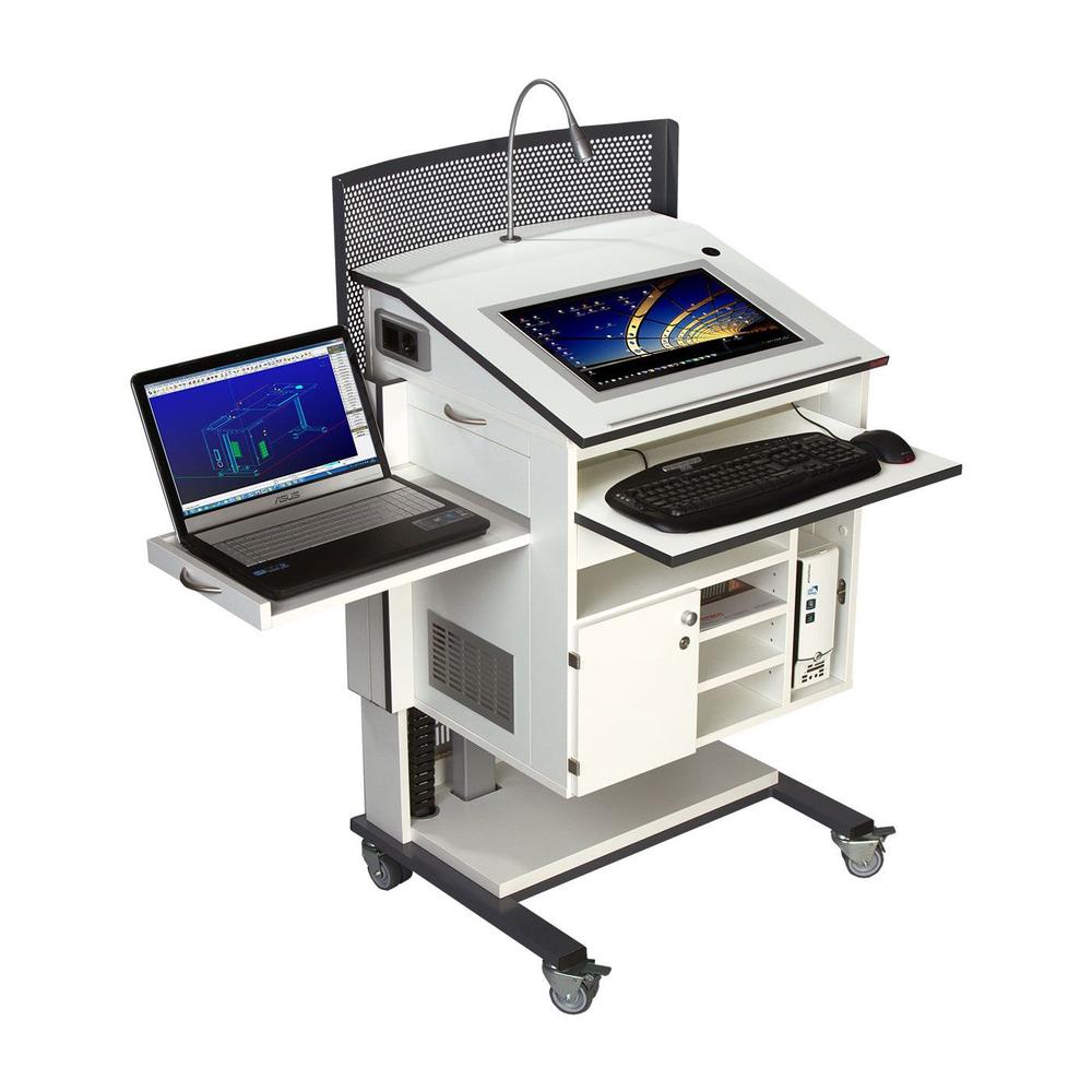 Sitz-/Steh Medienpult auf Rollen, welches Platz bietet um PC-gestütztes Arbeiten zu ermöglichen, jedoch auch für den normalen Schulbetrieb als Rednerpult, ohne störende Aufbauten verwendet werden kann. Durch die Mobilität ist es für die Nutzung in den Klassenräumen gedacht, wodurch überall die gleichen Voraussetzungen geschaffen werden, für alle Unterrichtsformen. Auch der Diebstahlschutz ist ein wichtiger Aspekt und kommt nicht zu kurz. Wechselseitige Ablagefächer, mit Ausziehstopp, zum Aufstellen von z.B. einer Dokumentenkamera, einem Laptop, usw. Auch der Einbau von 19-Zoll Einschüben ist möglich.